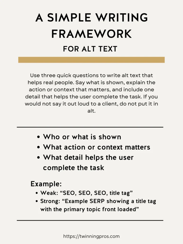 To make writing alt text feel straightforward and effective, especially if you’re just starting out with SEO, use a quick three-question guide that keeps your descriptions focused on helping real people.