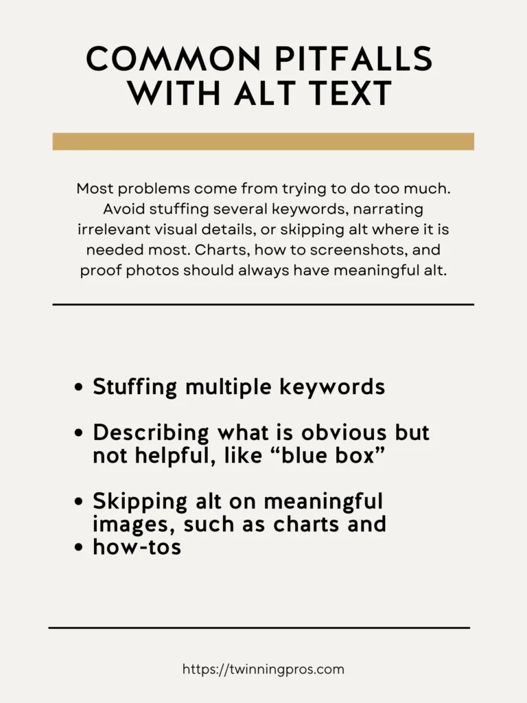 - Skipping alt on meaningful images such as charts and how tos – Misses key accessibility opportunities.