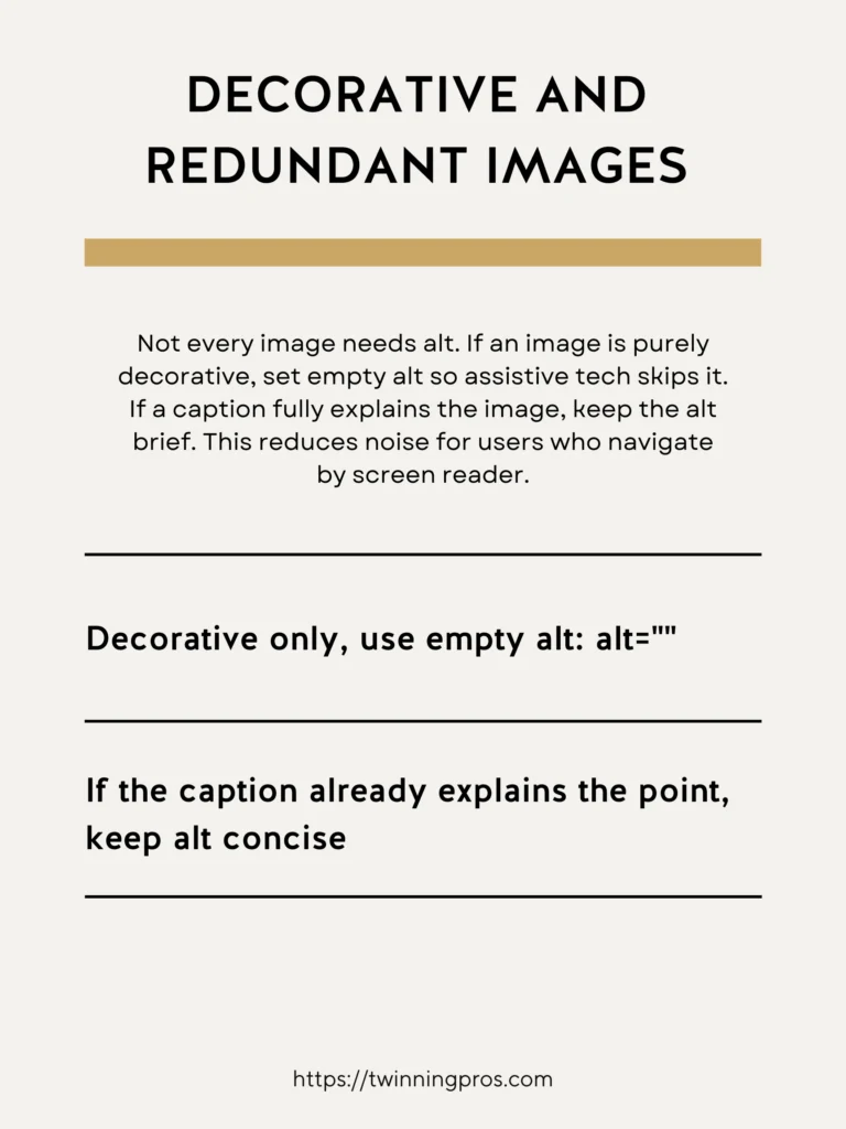- Decorative only, use empty alt: alt=”” – Lets tech ignore non-essential visuals.