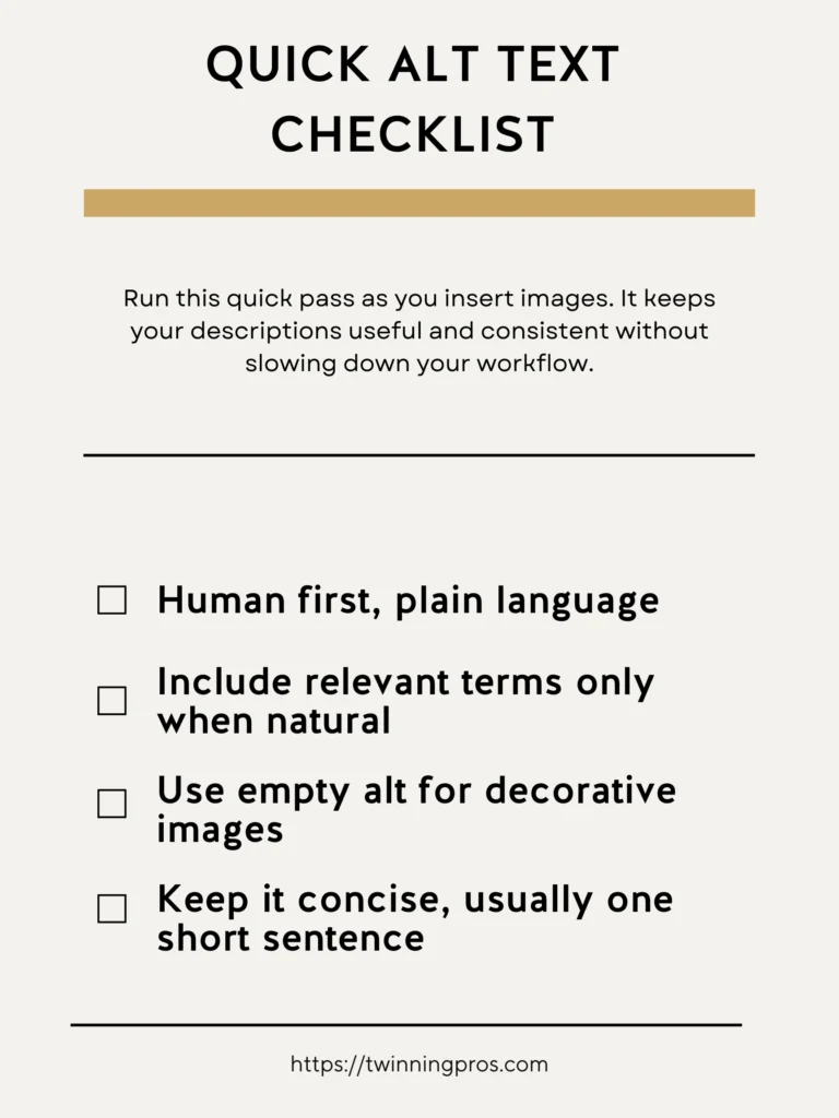 As you add images to your page, pause for a quick review using this beginner-friendly checklist. It ensures your descriptions are consistent and effective without adding much time to your process.