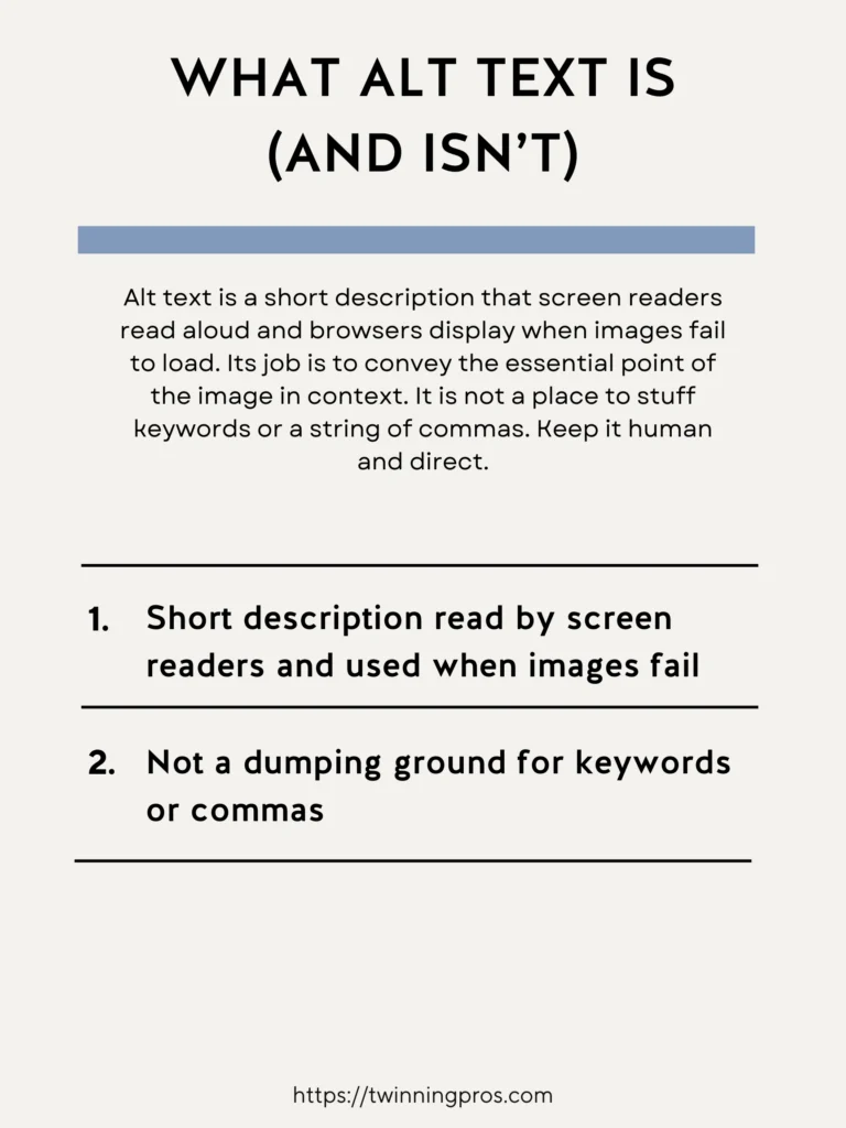 Alt text serves as a concise description embedded in your image’s code, which screen readers vocalize for users who can’t view the visual, and browsers show as a fallback if the image doesn’t load properly due to slow internet or technical issues.