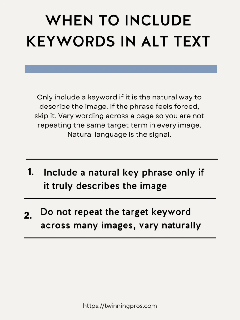 On a single page with multiple images, vary your wording to avoid repeating the same keyword phrase over and over, which keeps things fresh and authentic. This natural variety mimics real conversation and supports better overall page relevance.