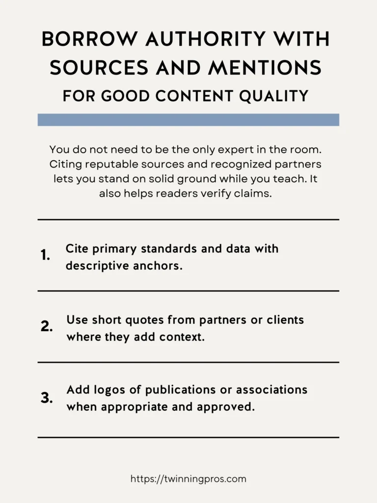 You don’t have to establish yourself as the ultimate expert all on your own. Linking to or mentioning well-respected outside sources can lend their credibility to your content, making your advice feel more grounded and verifiable. This approach allows you to teach effectively while standing on the shoulders of established knowledge, and it gives readers easy ways to double-check facts if they want. For beginners, this is a simple way to enhance your page’s trustworthiness: just choose a few relevant references and integrate them naturally.