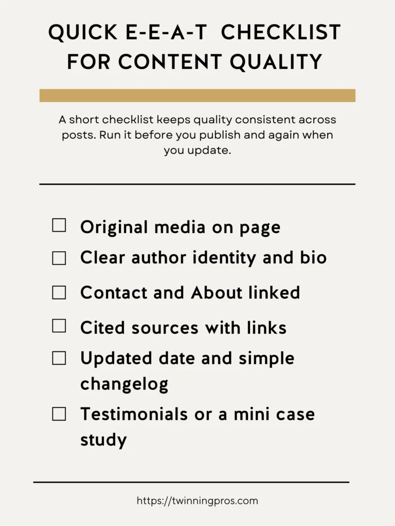 Use this checklist. Identify the author and credentials. Add proof sections that teach something specific. Link to primary data near claims. Add testimonials and case notes where they fit. Keep policies, address, and service details up to date. Review quarterly so quality does not drift.