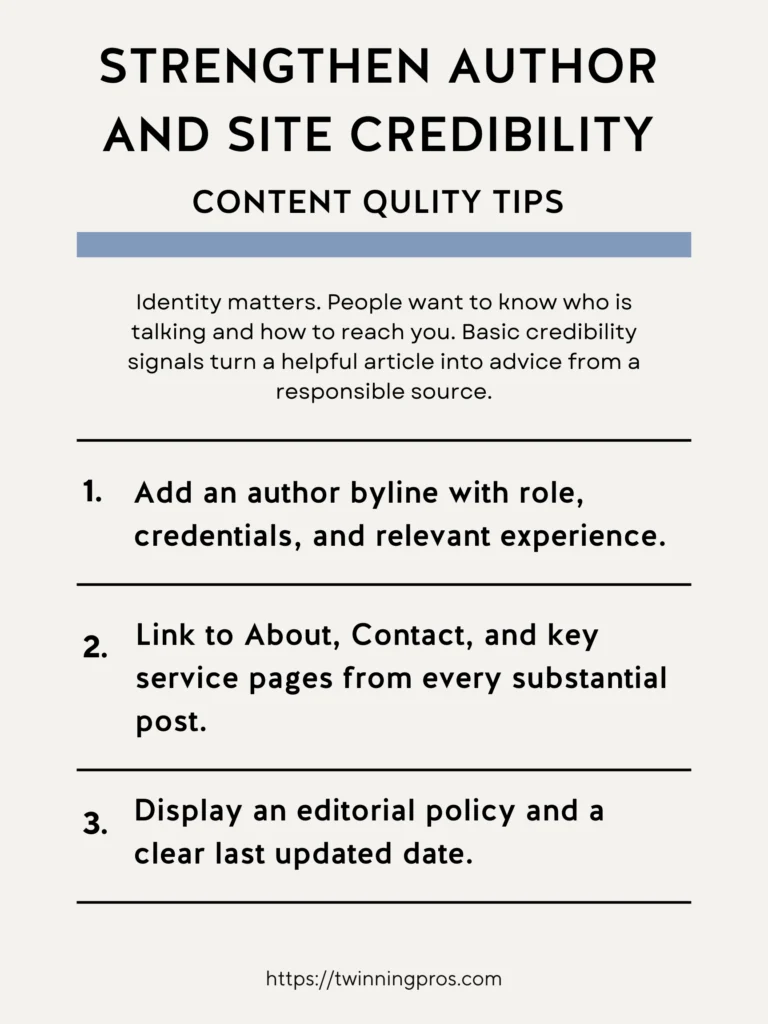Make the “who, how, and why” clear. Use bylines that link to an author page, cite primary sources, explain methods when relevant, and keep facts current. Google recommends clarifying who created the content and how it was produced.