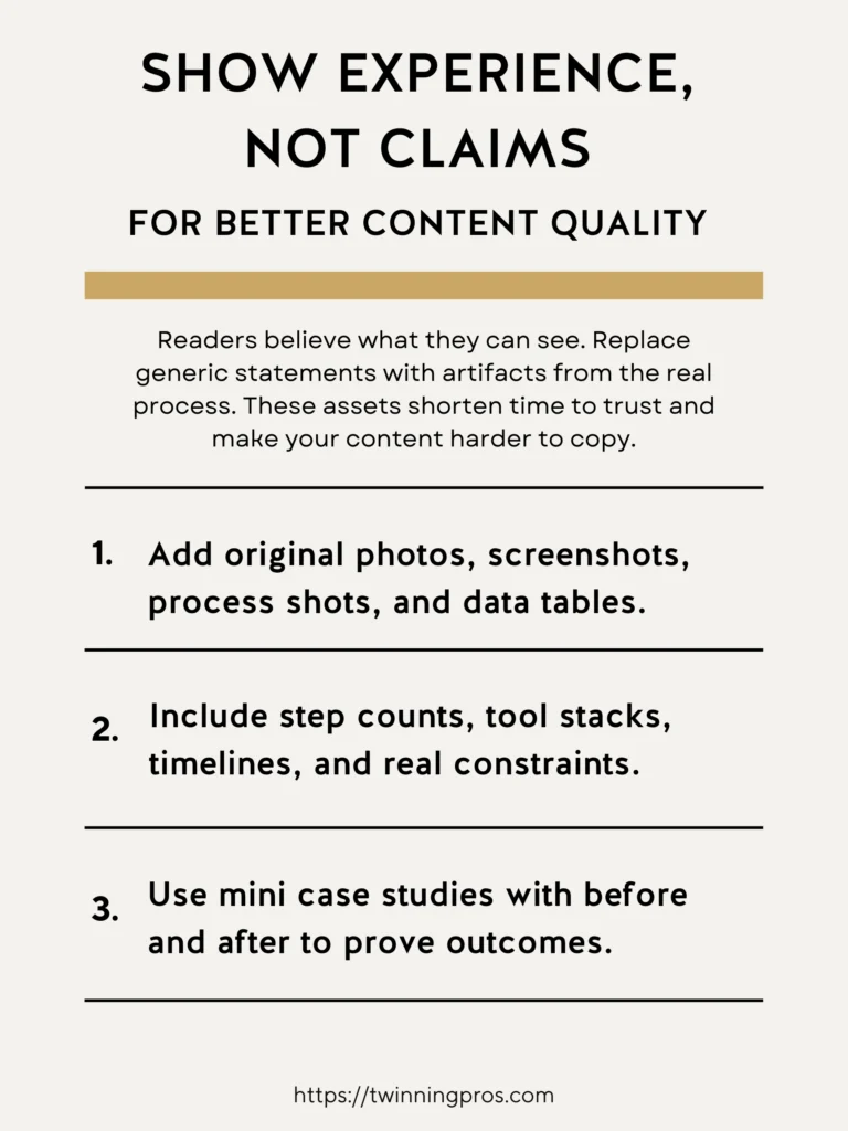 Add specifics only a practitioner would have: original photos or screenshots, brief case notes, results, or process details. Google encourages demonstrating first-hand expertise and depth of knowledge.