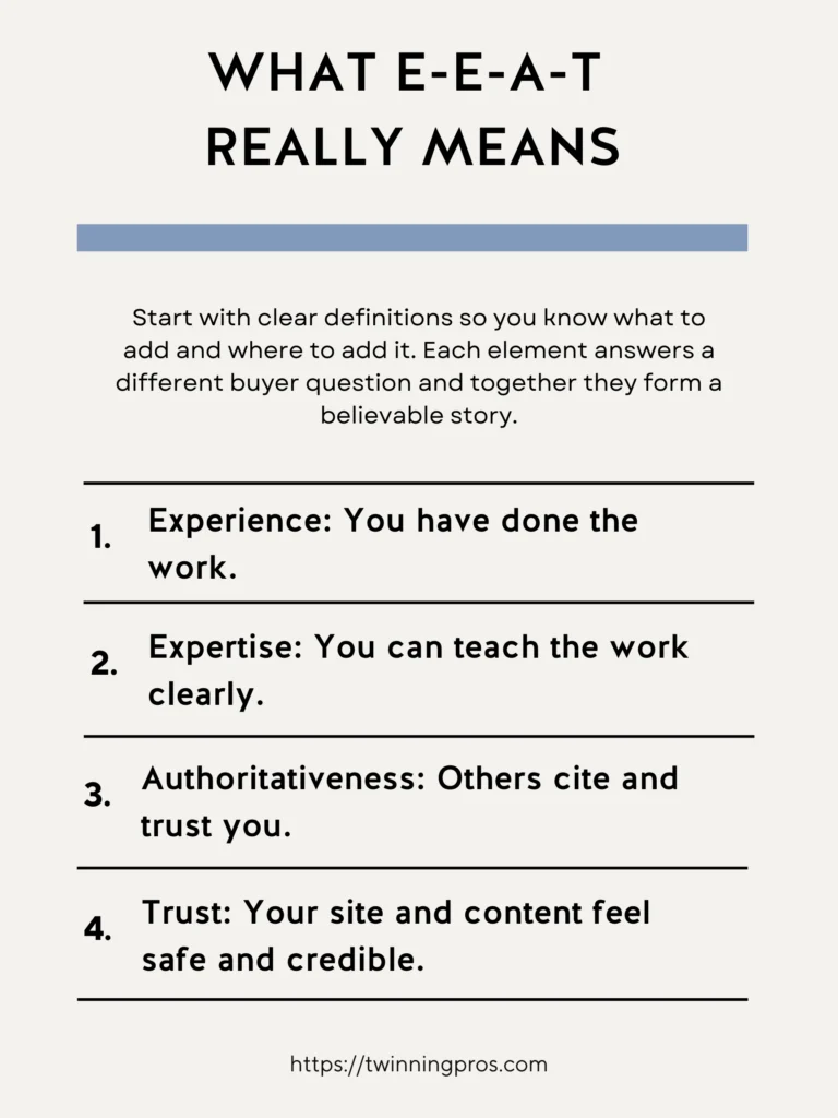 To get started with E-E-A-T, it’s helpful to break it down into its four parts with simple definitions, so you understand exactly what to include on your page and where it fits best. Each component addresses a common question that potential customers might have in their minds, and when combined, they create a complete, trustworthy narrative that reassures beginners that your content is worth their time and attention.