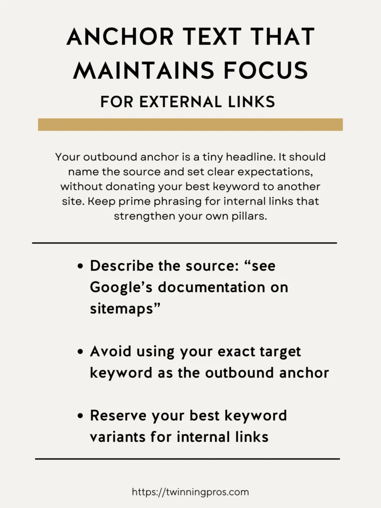 - Avoid using your exact target keyword as the outbound anchor – Prevents diluting your own relevance.