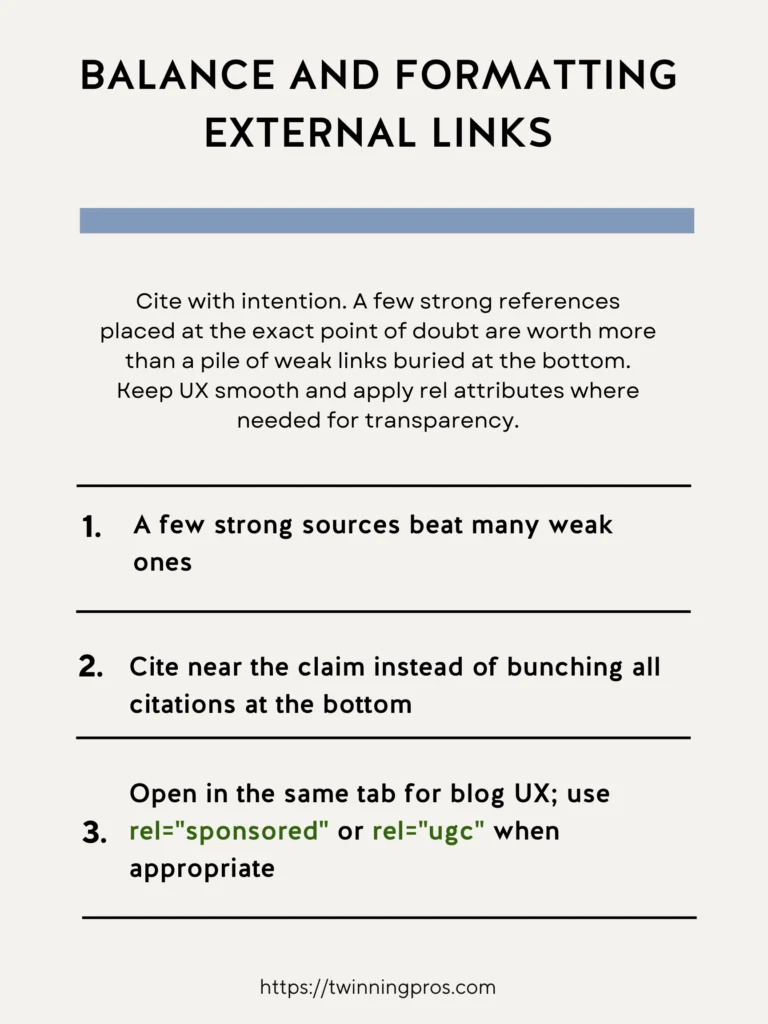 When it comes to how many external links to include and where to place them, less is often more. A handful of strong, relevant citations can build more trust than a long list of mediocre ones that overwhelm or distract.