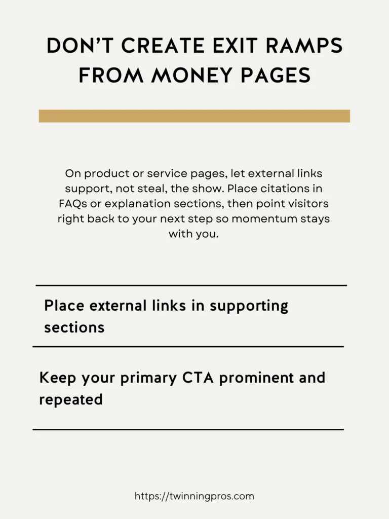 On pages designed to drive business, like those showcasing your products or services (often called “money pages”), external links should play a supporting role rather than stealing the show. Use them to bolster your arguments without tempting visitors to wander off.