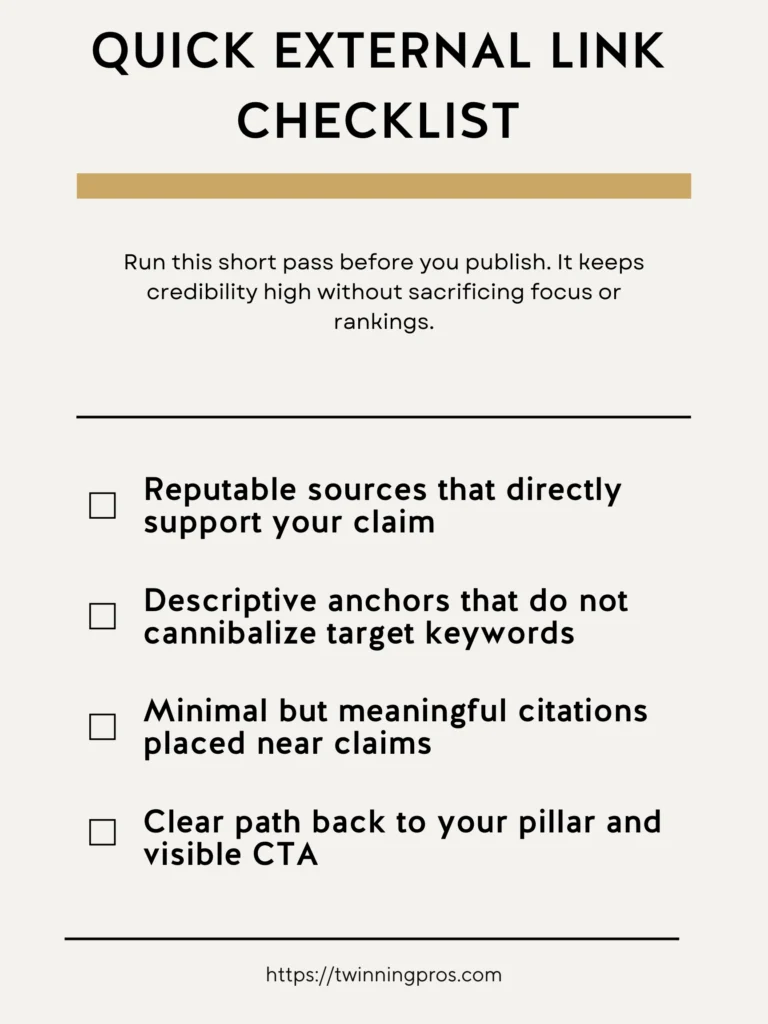 Before hitting publish on a new page, take a quick moment to review your external links with this simple checklist. It’s an easy habit for SEO beginners to ensure they’re adding value without any downsides.