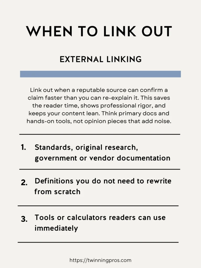 This is where external links come into play: they’re your way of pointing to trusted outside sources, like official standards, research data, or helpful tools, that support what you’re saying and build credibility.