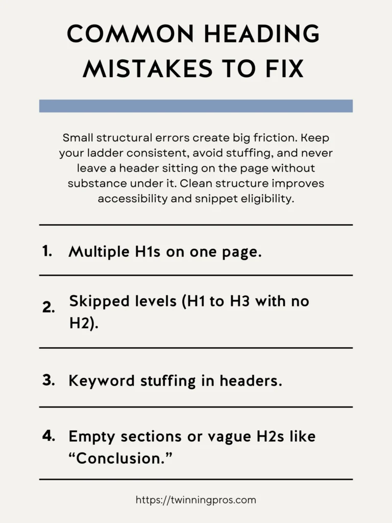 Even small slip-ups in how you use headings can create unnecessary hurdles for readers, slowing them down or causing confusion that leads to higher bounce rates. To avoid this, maintain a consistent structure across your page, resist the urge to cram keywords unnaturally into headings (which can look spammy to both people and search engines), and ensure no heading stands alone without meaningful content following it.