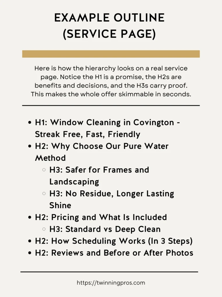 To see how this all comes together in practice, let’s walk through a sample outline for a typical service page, like one for a local business. This shows the hierarchy in action and how it makes the content quick to scan.