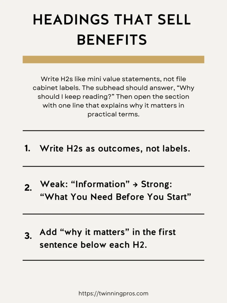 Craft your H2 headings as compelling mini-statements that emphasize value, rather than bland labels that could fit in a filing system. This way, they answer the reader’s unspoken question: “What’s in it for me if I read this section?”
