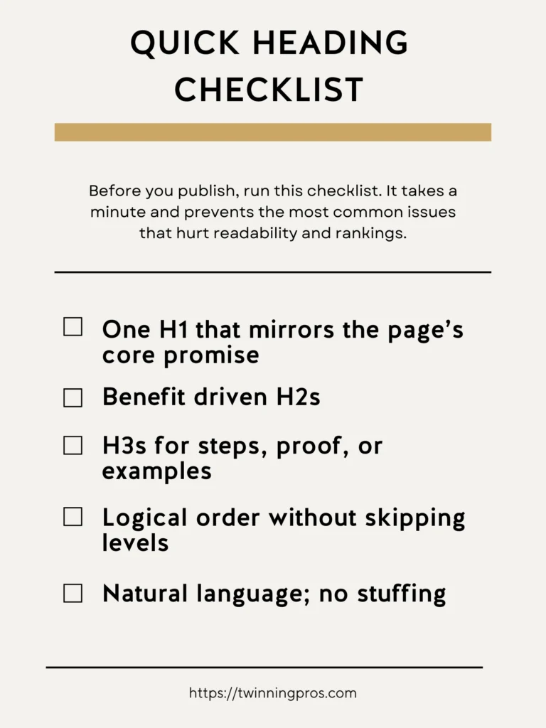 Right before you hit publish on a new page or update an existing one, take a quick minute to go through this checklist. It’s a simple safeguard that catches common oversights and ensures your headings are doing their job effectively. This routine is especially helpful for SEO beginners, as it promotes consistency, enhances readability for your audience, and aligns with what search engines favor for better rankings, all without adding much extra time to your workflow.
