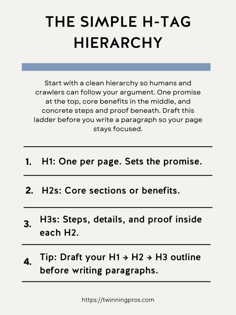 • Tip: Draft your H1 → H2 → H3 outline before writing paragraphs. – This simple step saves time and keeps your page cohesive.