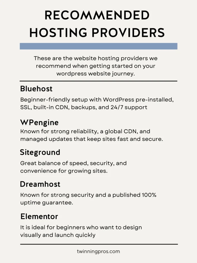 Start with reputable shared hosting or managed WordPress that includes one-click installs, free SSL, daily backups, and 24/7 support. Good beginner options include Bluehost, WPEngine, SiteGround, and DreamHost.