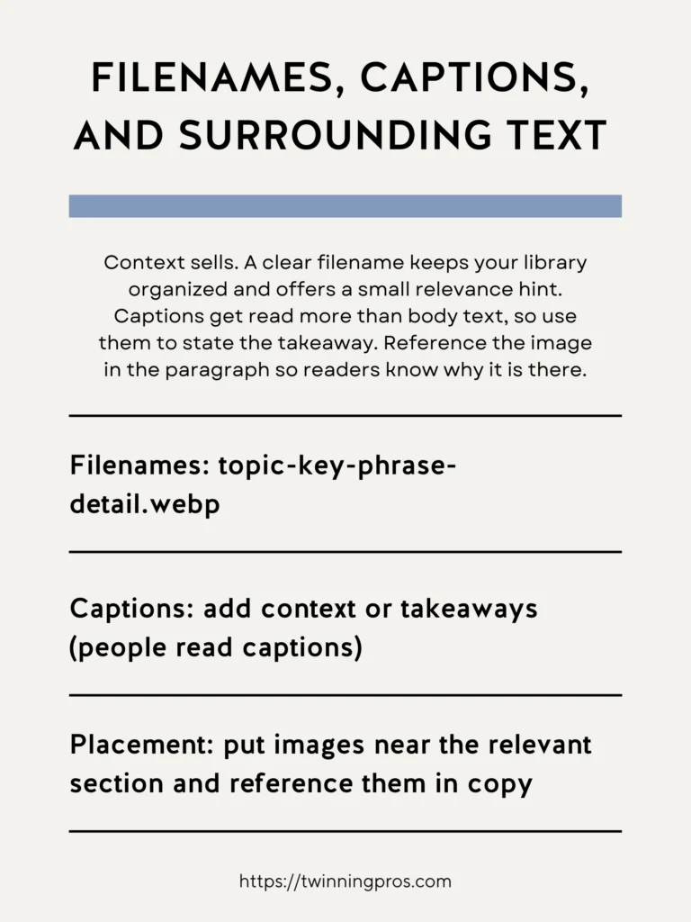 • Filenames: topic-key-phrase-detail.webp – Makes them searchable and organized, like “seo-title-tag-example.webp.”