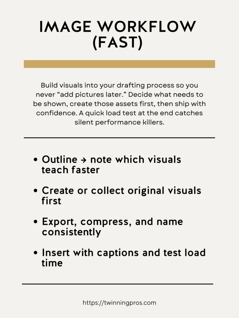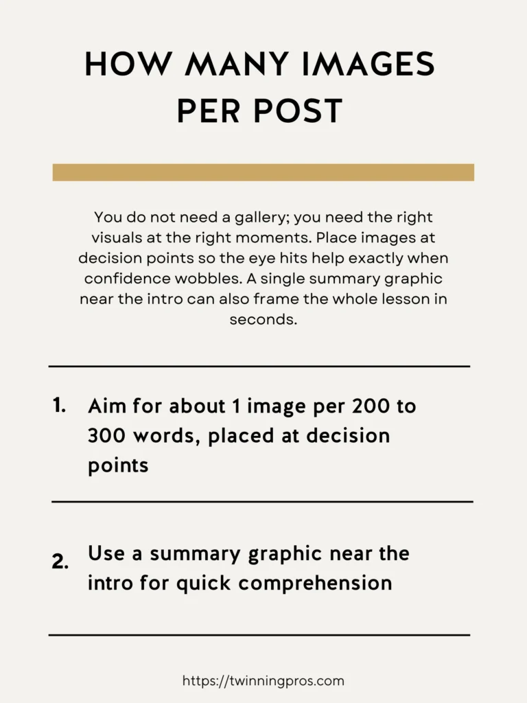 • Aim for about 1 image per 200 to 300 words, placed at decision points – This spacing keeps the page balanced and relevant.