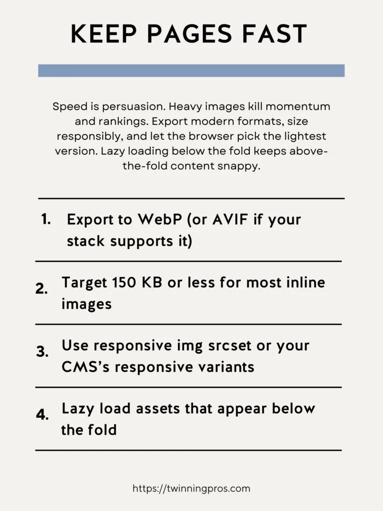 • Use responsive img srcset or your CMS’s responsive variants – Automatically serves the right size for phones or desktops.