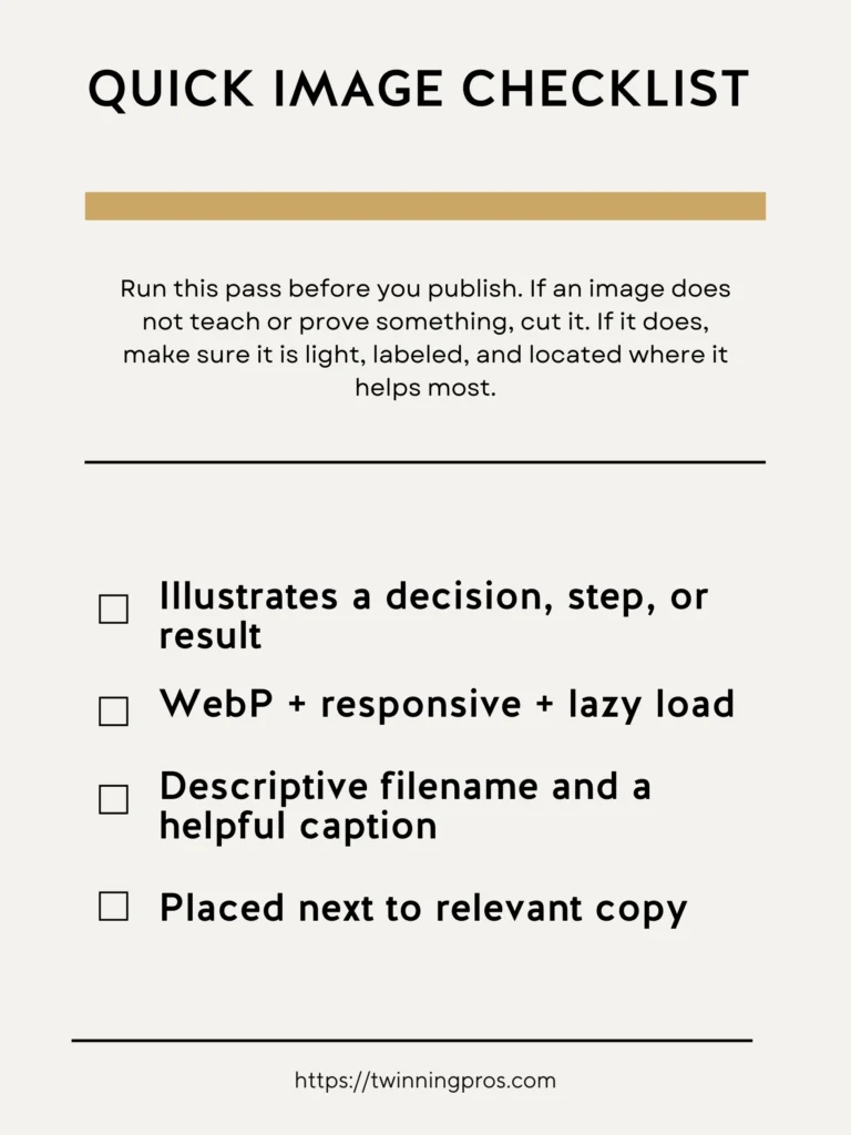 Before finalizing and publishing your page, take a minute to review your images with this simple checklist. It’s a beginner-friendly way to ensure each one contributes meaningfully without any drawbacks. Ask if the image truly helps illustrate a choice, process, or outcome; if not, consider removing it to keep things focused. Then, confirm it’s optimized for speed, properly labeled for clarity, and positioned where it supports the text best, making your content more effective and professional.