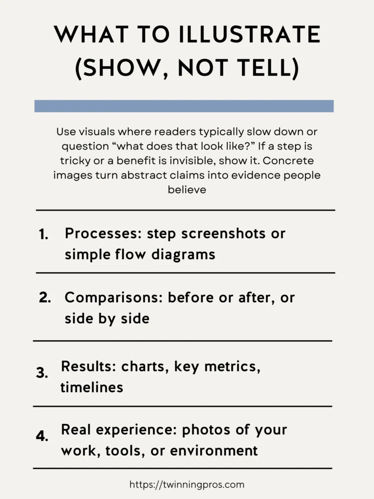 When creating content, focus on using images to demonstrate ideas rather than just describing them. This “show, don’t tell” principle is especially useful for SEO beginners, as it helps address spots where readers might pause, wondering what something actually looks like or how it works in practice.