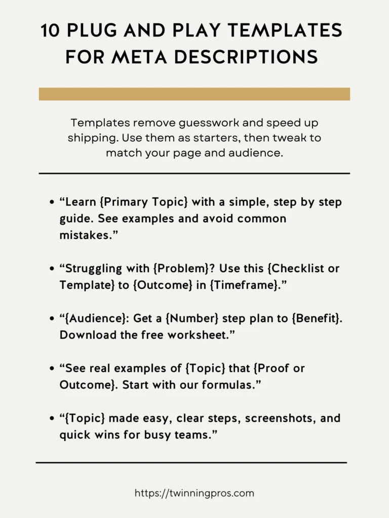 Templates are like ready-made outlines that take the stress out of writing, especially for SEO newcomers. They give you a starting point so you can focus on customizing rather than staring at a blank page. These 10 options are versatile starters; just plug in your page’s main topic, audience, or key details, and adjust the wording to sound like your natural voice. They’re designed to be straightforward and effective, helping you create descriptions quickly that highlight value and encourage clicks.