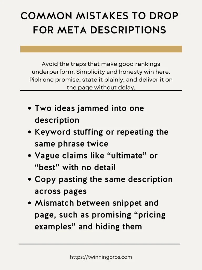 Even with good intentions, certain habits can sabotage your efforts and make strong rankings less effective. The goal is to keep things simple, honest, and focused. Stick to one main idea, use plain language, and make sure what you promise is exactly what the page provides right away. Avoiding these pitfalls will help your descriptions feel more genuine and perform better for attracting the right visitors.