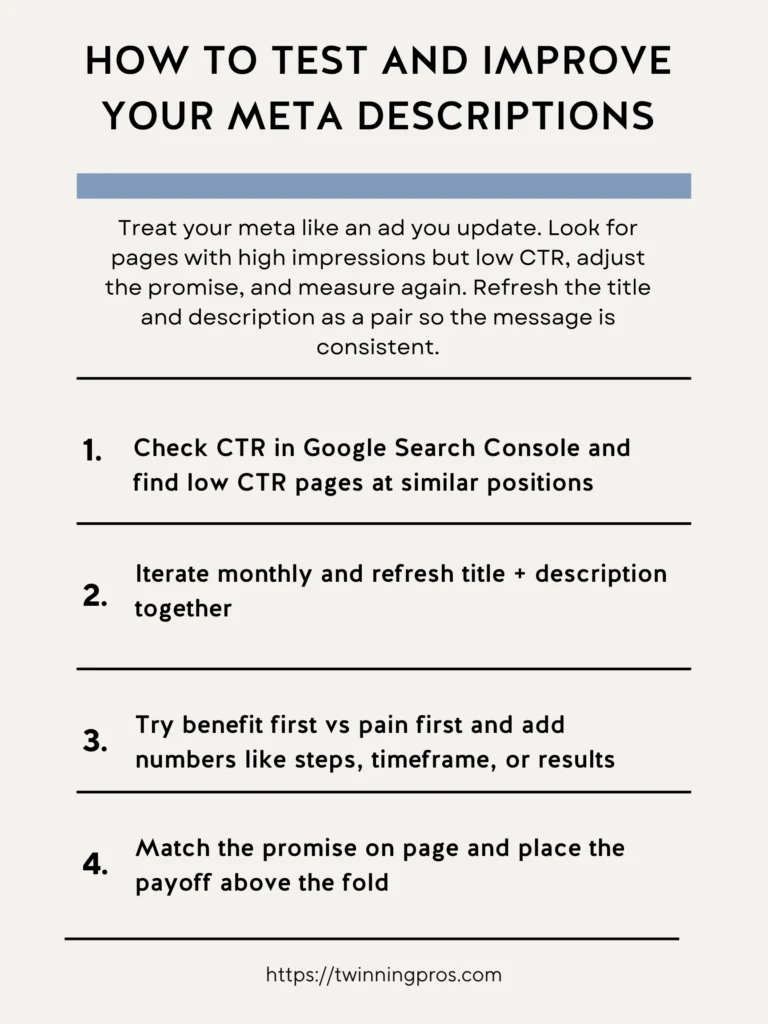 Here is a simple playbook. Write one benefit first version, one proof first version, and one curiosity led version for each key page. Keep it to roughly 150 to 160 characters, use the primary topic once, and mirror the page’s first section so the handoff feels seamless. Review Search Console by page. If impressions are healthy and CTR lags, swap in the strongest variant and retest.