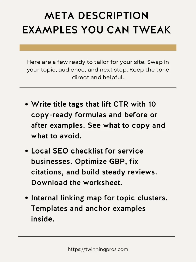 - “Write title tags that lift CTR with 10 copy ready formulas and before or after examples. See what to copy and what to avoid.” – For SEO tips.