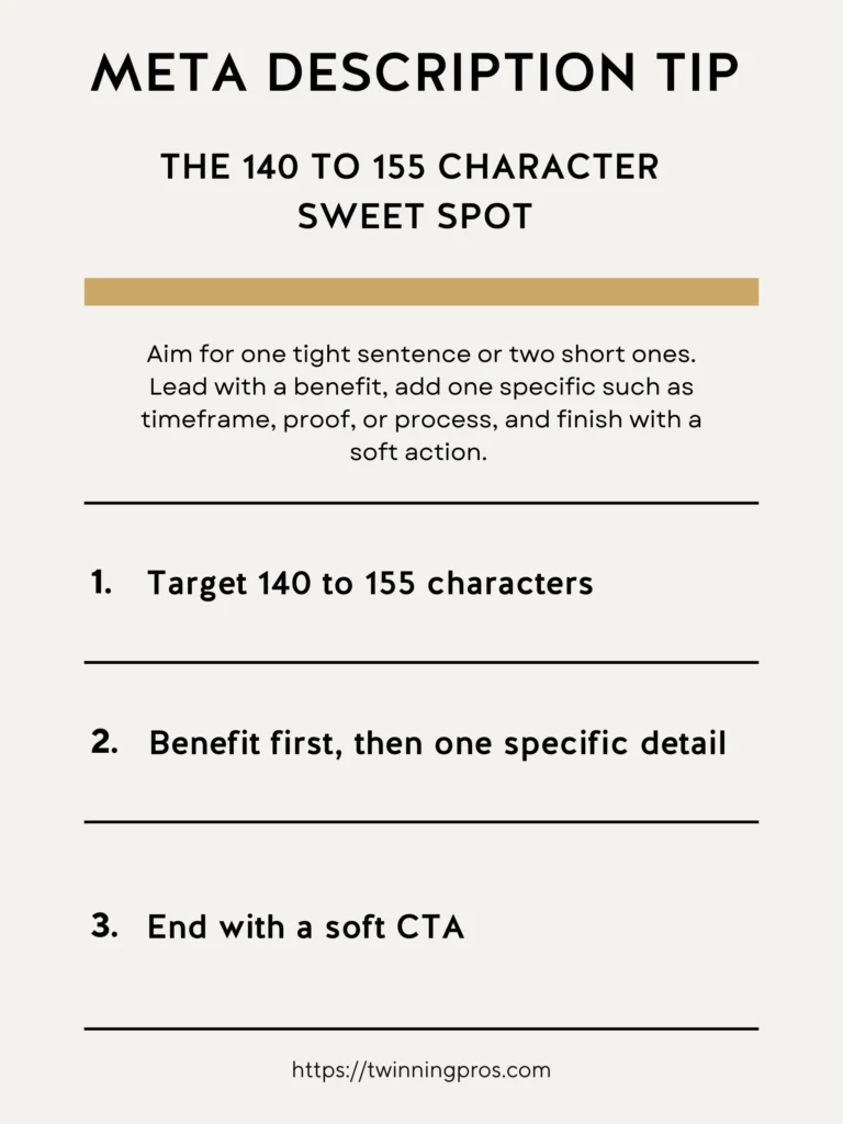 - Target 140 to 155 characters – Ensures it displays fully on most devices.