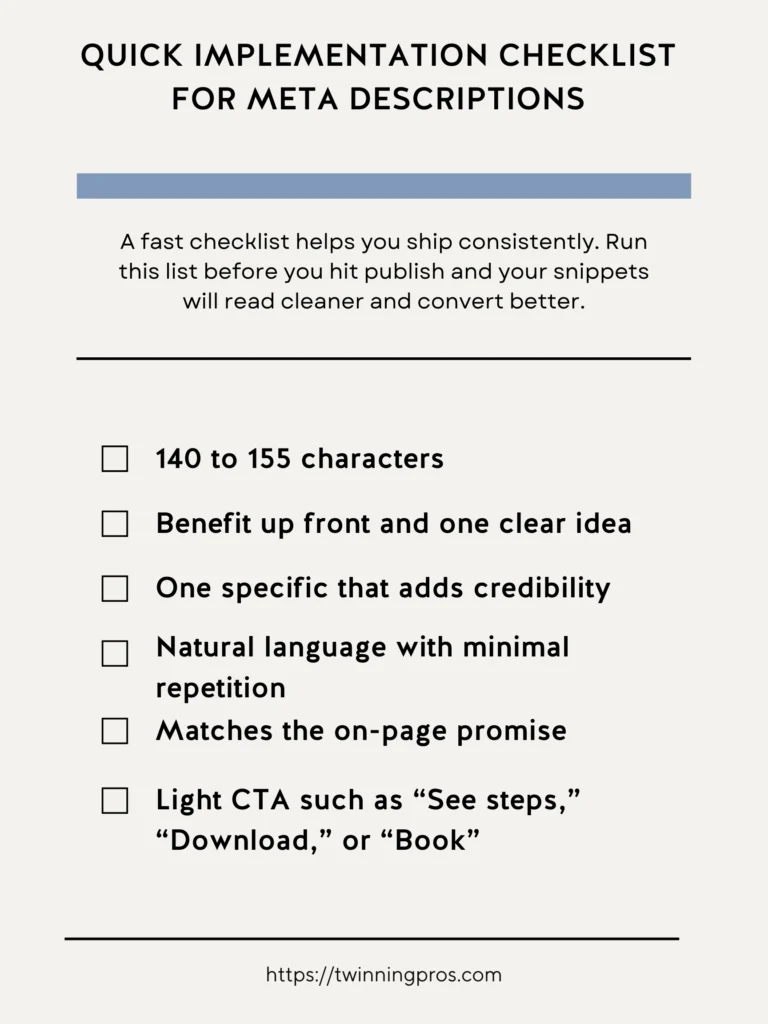 This handy checklist is like a quick safety net. It ensures every meta description you create is polished and ready to perform. As a beginner, running through it before publishing takes just a minute or two but catches issues that could otherwise reduce clicks. It promotes consistency, so your site’s search snippets always come across as clear, credible, and inviting.