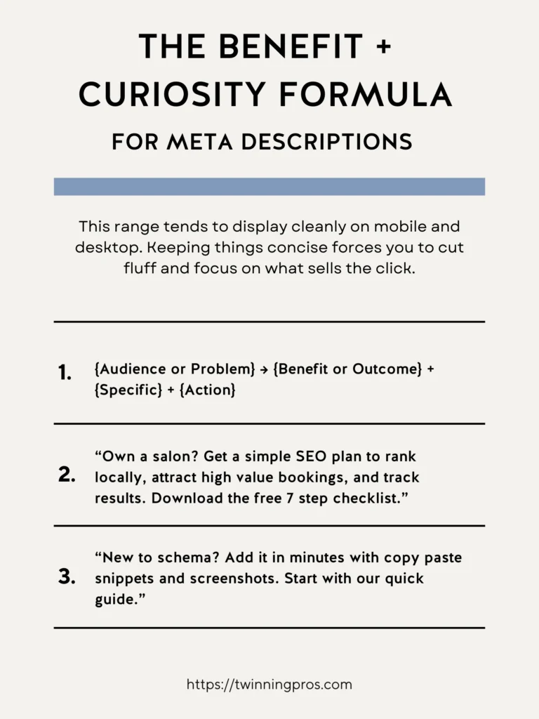 A reliable way to craft meta descriptions is to follow a basic pattern that balances helpfulness with just enough intrigue to spark interest, all without over-the-top hype. You’re essentially talking directly to the reader, addressing their situation or need, promising a positive result, backing it up with a concrete detail, and suggesting a small, easy action. This combination of benefit (what they get) and curiosity (wanting to know more) is perfect for getting meaningful clicks from people who will actually benefit from your content.