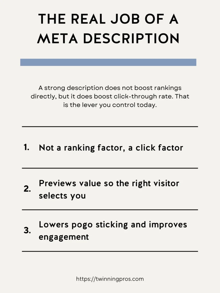 A powerful meta description doesn’t magically improve where your page shows up in search rankings. That’s handled by other SEO factors. Instead, its main role is to increase your click-through rate (CTR), which is simply the percentage of people who see your page in results and decide to click on it. You can start optimizing this today without needing advanced skills.