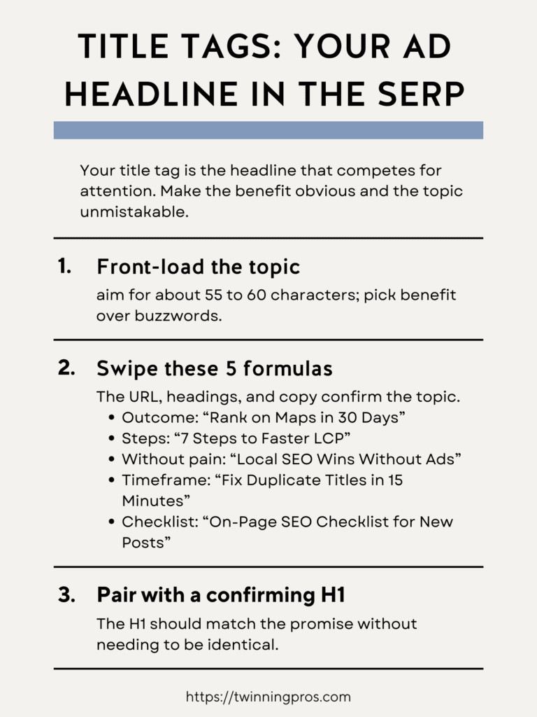 - Test benefit-first vs pain-first angles and iterate using CTR in Search Console.