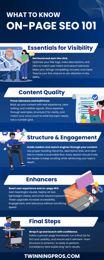 It’s the set of things you control on a page so searchers (and Google) can understand, trust, and use it: clear titles/headings, crawlable links, helpful copy, and a good page experience. Google’s starter guidance: create helpful, reliable, people-first content and place the words your audience uses in prominent spots like the title, main heading, alt text, and link text.