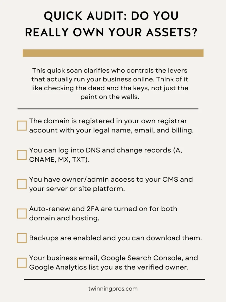 Ownership is not optional. If you don’t control your domain, DNS, hosting, and admin logins, you’re renting your brand and risking your growth. Take the three steps above today and set your business up for long-term security and scale.