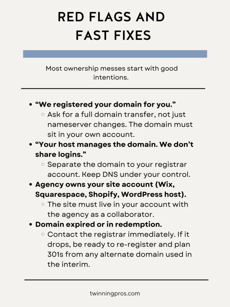 Separate the domain to your registrar account. Keep DNS under your control. - Agency owns your site account (Wix, Squarespace, Shopify, WordPress host).