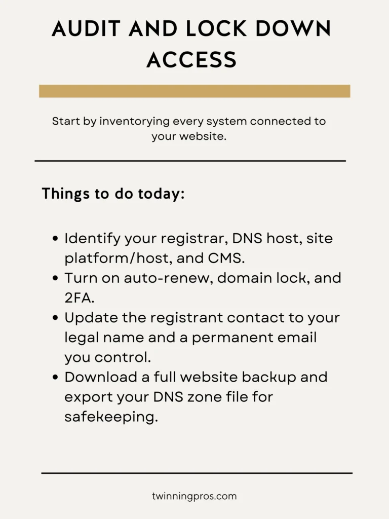 Start by inventorying every system connected to your website. Identify who your registrar is, which provider hosts DNS, where the site lives, and who has access. Turn on the protective basics like auto-renew, domain lock, and two-factor authentication. Then capture a snapshot of your current state with a full site backup and a DNS export. This gives you both control and a clean restore point if something goes wrong.