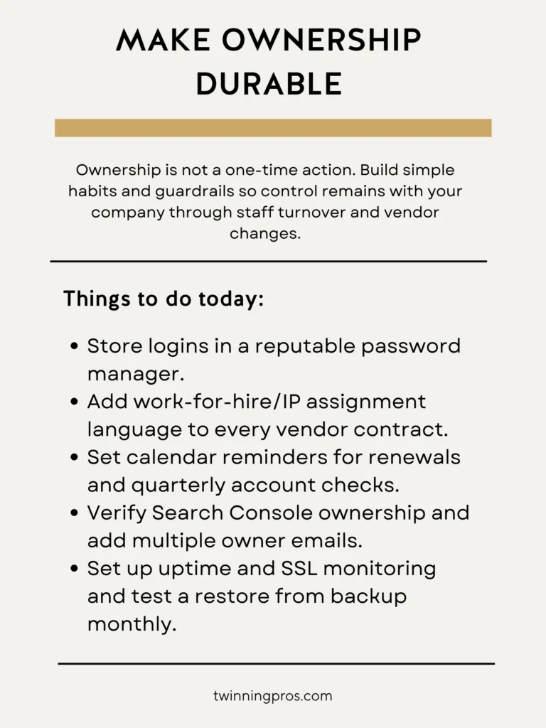 Ownership is not a one-time action. Build simple habits and guardrails so control remains with your company through staff turnover and vendor changes. Use a password manager for shared access, put IP and work-for-hire language in contracts, and calendar the key renewals. Verify Search Console ownership with multiple emails and monitor uptime and SSL so you catch issues before customers do. A few lightweight procedures will save you from expensive emergencies later.