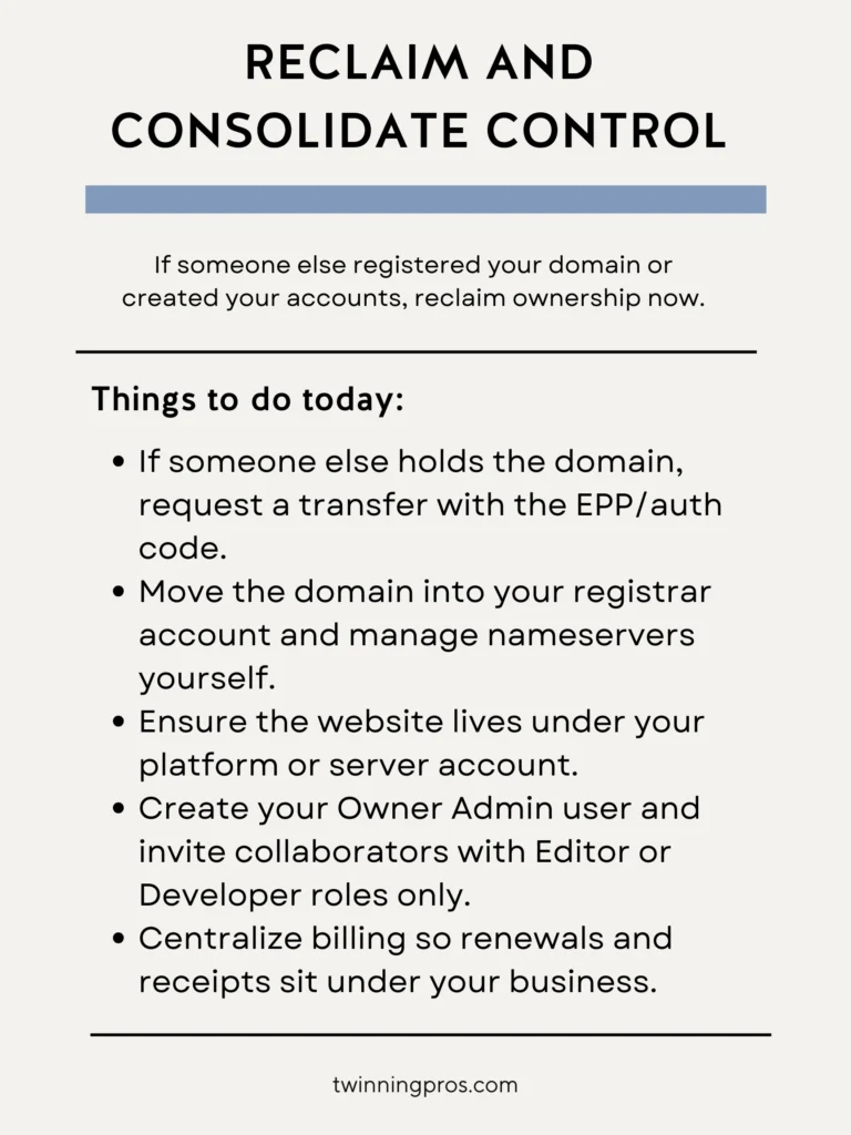 If someone else registered your domain or created your accounts, reclaim ownership now. Ask for the EPP or auth code, transfer the domain into your registrar account, and ensure the website is inside an account you own. Centralize billing so renewals do not depend on a third party. From there, grant collaborators the access they need without giving away the keys. This step removes single points of failure and prevents future bottlenecks.