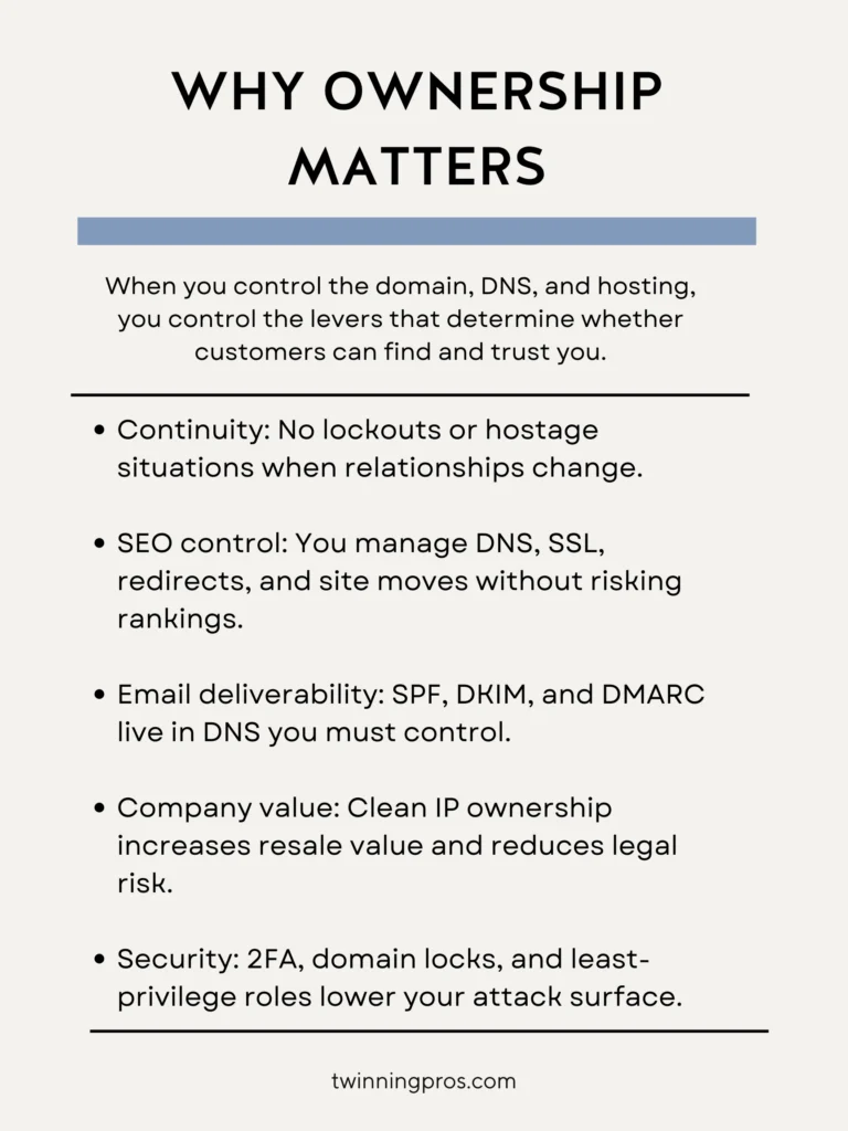 When you control the domain, DNS, and hosting, you control the levers that determine whether customers can find and trust you. Ownership protects revenue during vendor changes, reduces the chance of emergency outages, and lets you act quickly on SEO and security. It also improves the real-world value of your company because the core digital assets are cleanly transferable. These are not technical niceties. They are business fundamentals.