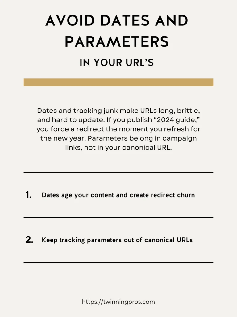 Including dates or extra tracking codes (like UTM parameters) in your main URLs might seem convenient at first, but they can create problems down the line, making your content feel outdated or complicated to maintain. For instance, a slug with “2024” in it means you’ll likely need to update and redirect it when the year changes, which can be a hassle for beginners. Tracking details are better saved for temporary campaign links, not the permanent (canonical) URL that search engines use as your page’s official address. By avoiding these, you make your site more timeless and easier to manage long-term.