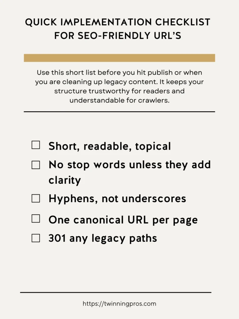 Before you publish a new page or tidy up older ones, run through this simple checklist. It’s like a quick quality check that ensures your URLs are trustworthy and optimized without much effort. This is especially useful for beginners, as it covers the basics to make your site more appealing to both people and search engines, step by step.