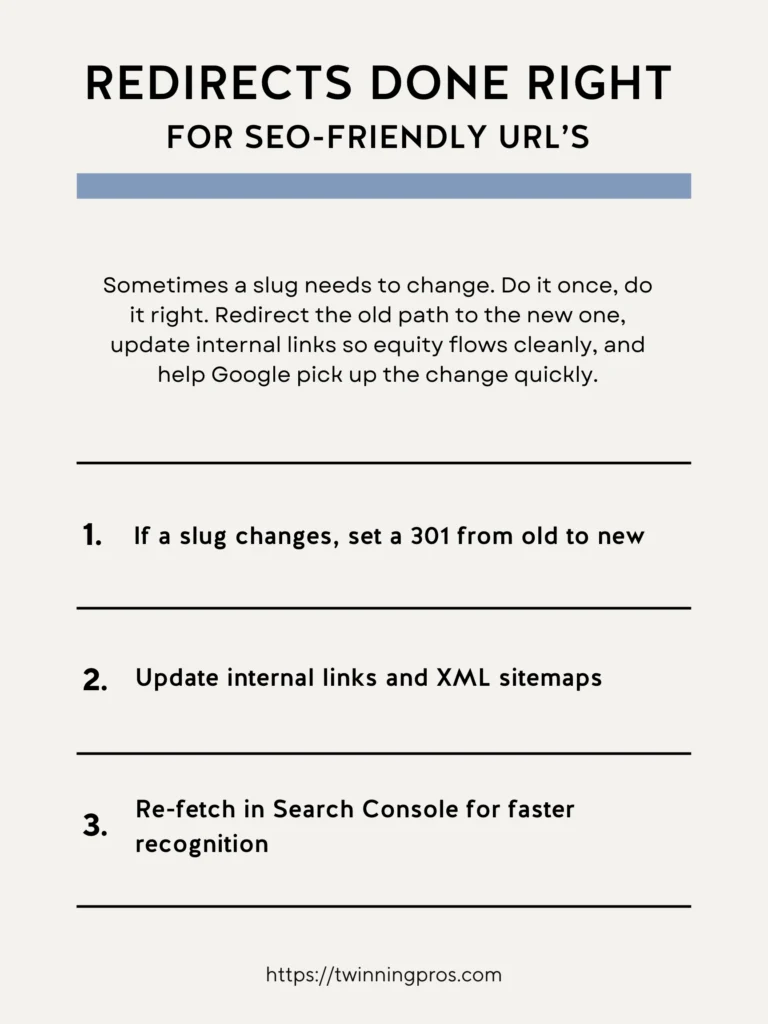- If a slug changes, set a 301 from old to new – This preserves traffic and SEO benefits.