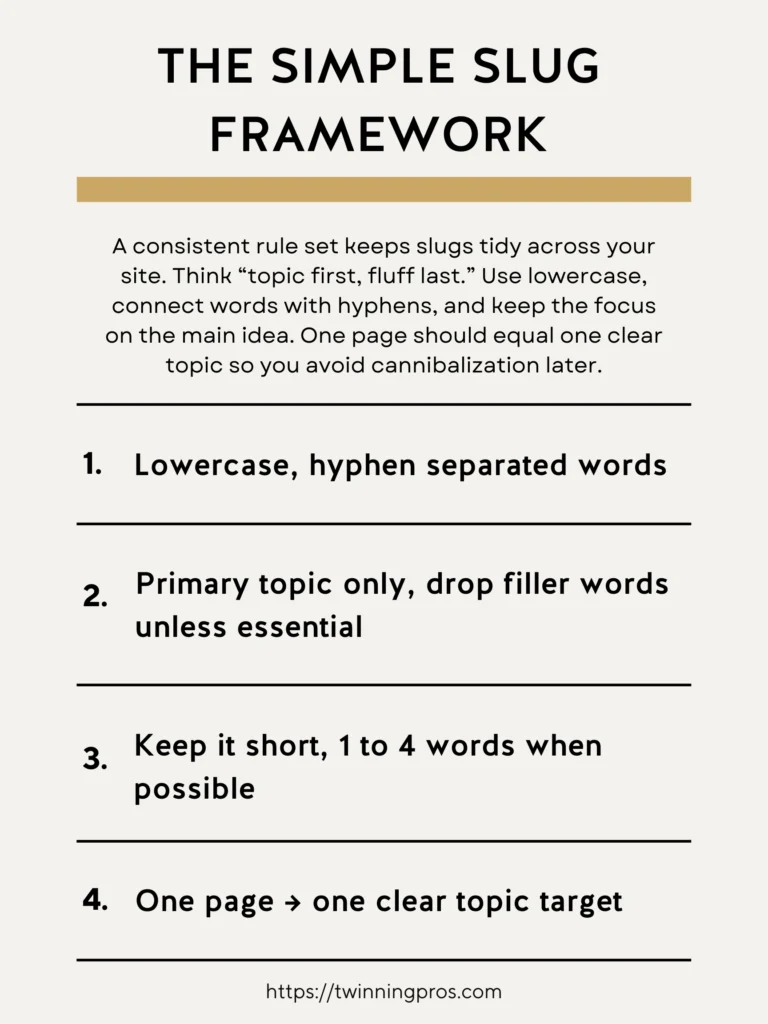 Having a basic set of rules for creating slugs ensures consistency across your entire website, which is especially helpful if you’re just starting out and want to avoid a jumbled mess later on. Think of it as “topic first, extras last.” Focus on the core idea of the page while keeping things tidy. Use all lowercase letters to avoid case-sensitivity issues, connect words with hyphens instead of spaces or underscores, and stick to the essentials that describe the content. Importantly, dedicate each page to just one main topic; this prevents your pages from competing against each other in search results, a common beginner mistake known as keyword cannibalization.