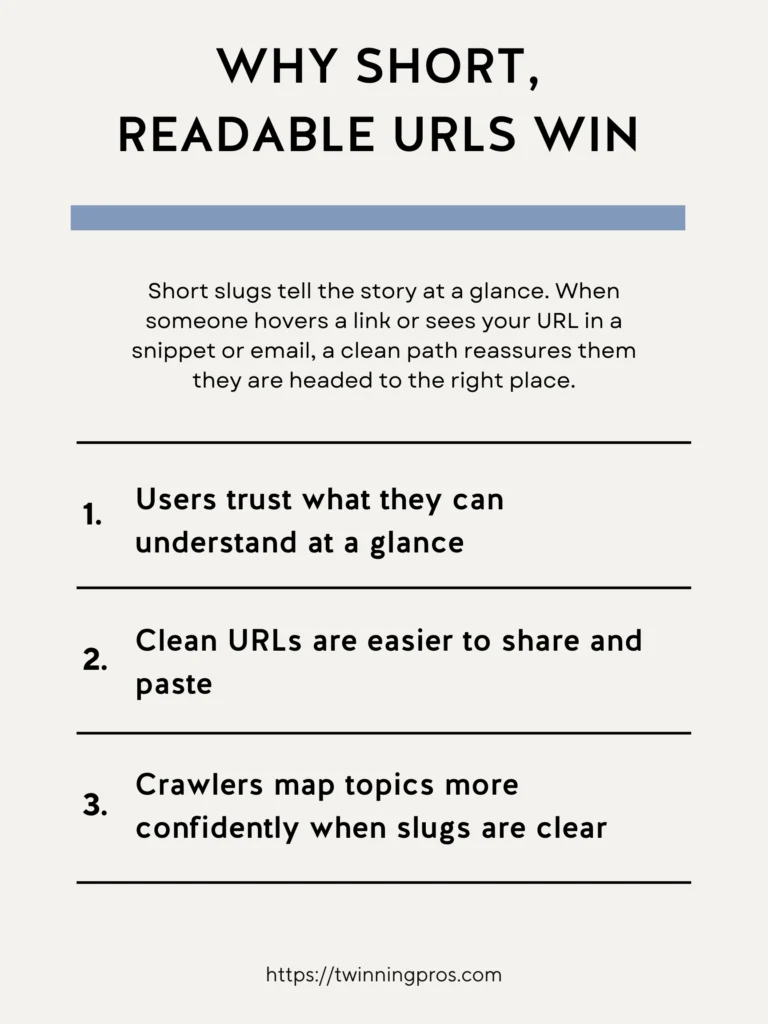 Choosing short, easy-to-read slugs is like putting up a clear signpost that guides people exactly where they need to go without any confusion. When someone hovers over a link in search results, sees it in a social media post, or receives it in an email, a simple slug instantly reassures them that the page matches what they’re interested in.
